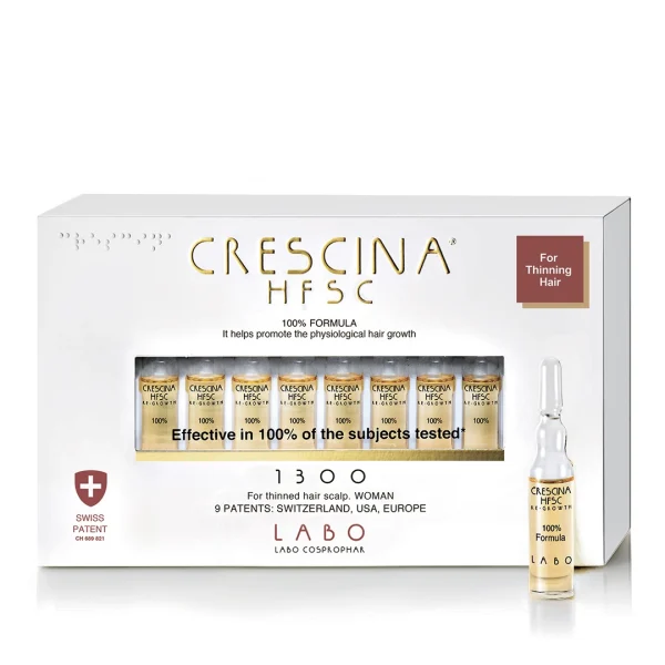 Crescina HFSC Transdermic 1300 – это ампульное косметическое средство поверхностного нанесения, восстанавливающее физиологический рост волос при постепенном уменьшении их количества и качества из-за снижения активности волосяных фолликул. Ампулы предназначены для использования при поредении волос, вызванном физиологическими, но не патологическими причинами.